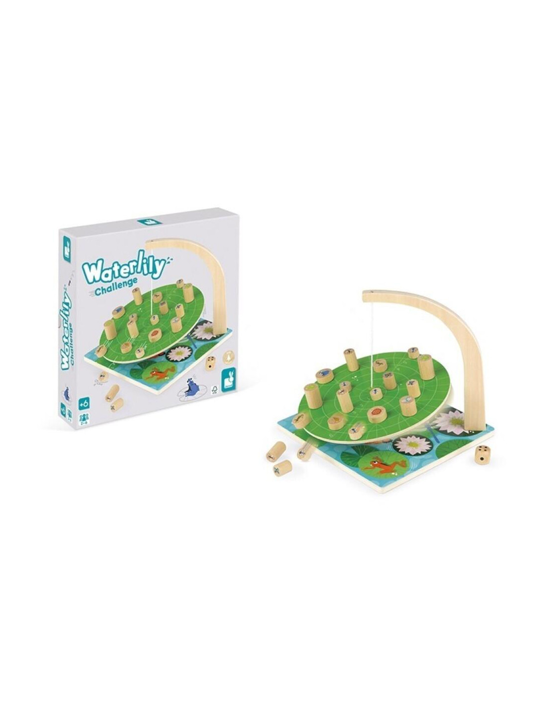 Cada jugador deberá elegir y luego colocar un animal/insecto sobre el nenúfar sin hacerlo volcar. Atención: se perderá la partida si se caen todas las piezas. Es necesario ser hábil y táctico para sobrevivir en la charca. ¡Este juego desarrolla la destreza y la concentración! Una plataforma de madera con un nenúfar encima y 42 piezas de tamaños diferentes. De 2 a 6 jugadores. Plataforma : 22 x 22 x 1 cm. Nenúfar : 21,5 x 21,5 cm. Con reglas del juego incluidas en francés, inglés, alemán, español e italiano.