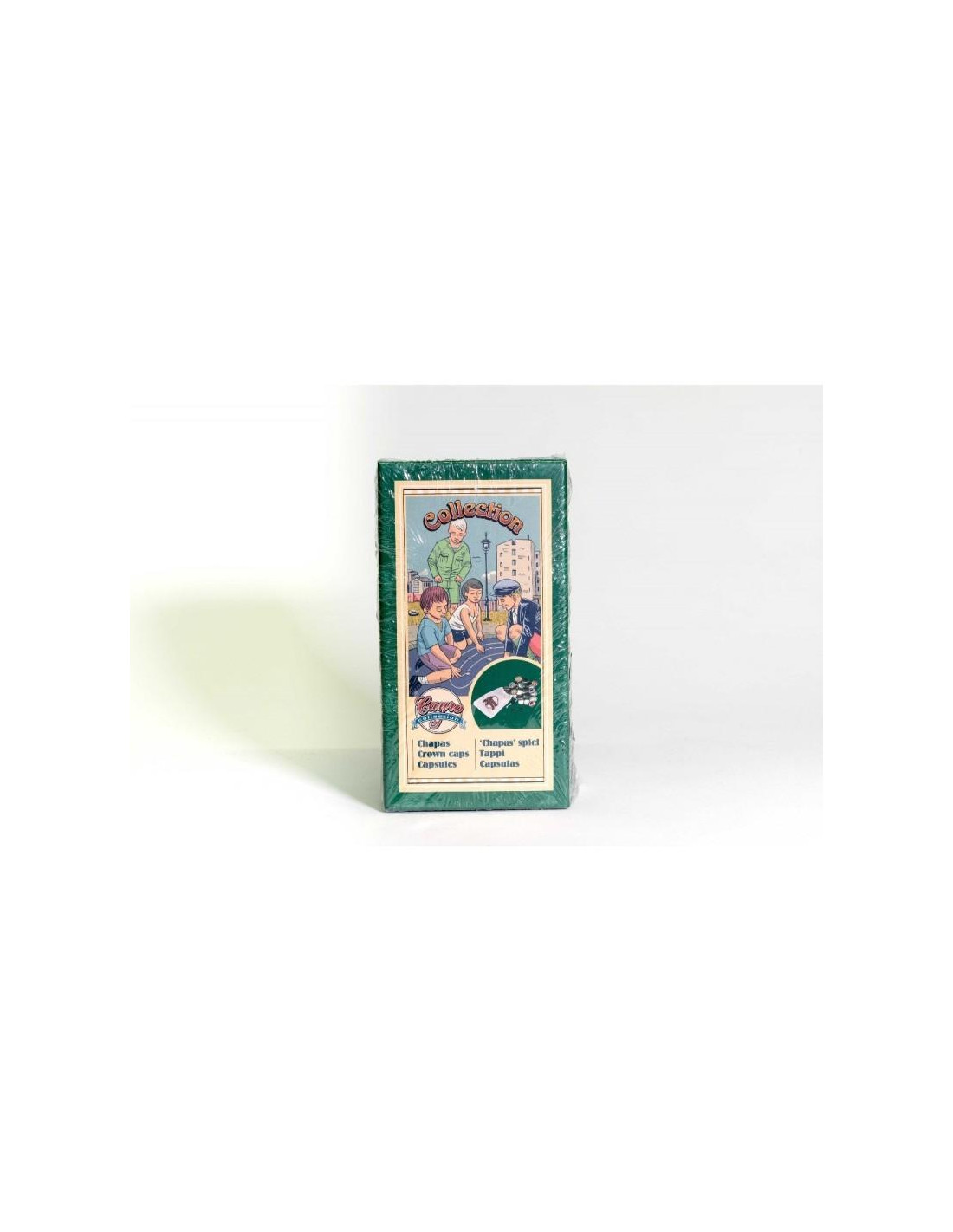 El juego Cayro Collection Chapas se presenta en una caja de cartón con dibujo de aire vintage, que contiene una bolsa de algodón para guardar las 25 chapas (tapones de botellas), 2 mitades de una bola y unos discos de cartón para introducir en las chapas con los dibujos de la época.