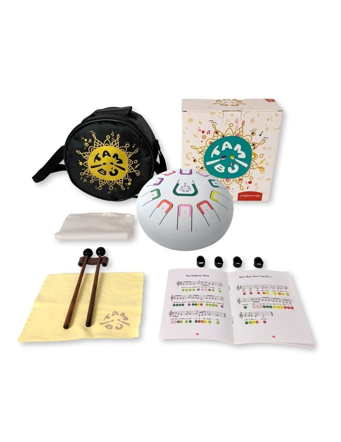 El TAMBÚ puede hacerse sonar de diferentes maneras. Viene acompañados de partituras en números y colores para aquellos que empiezan.