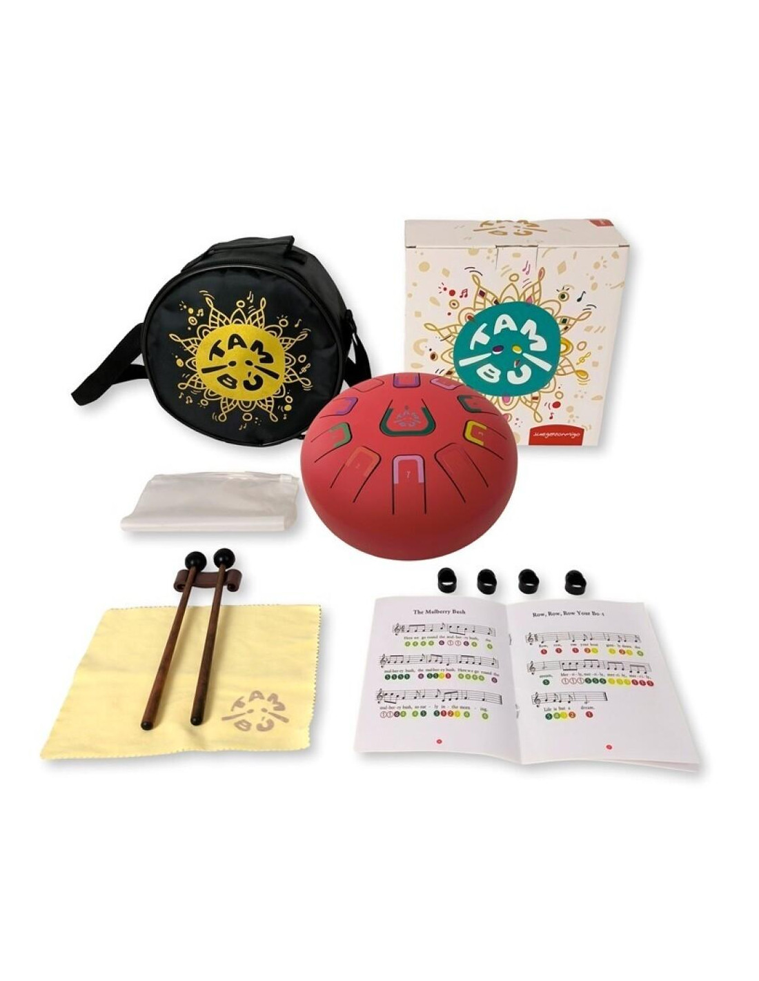 El TAMBÚ puede hacerse sonar de diferentes maneras. Viene acompañados de partituras en números y colores para aquellos que empiezan.