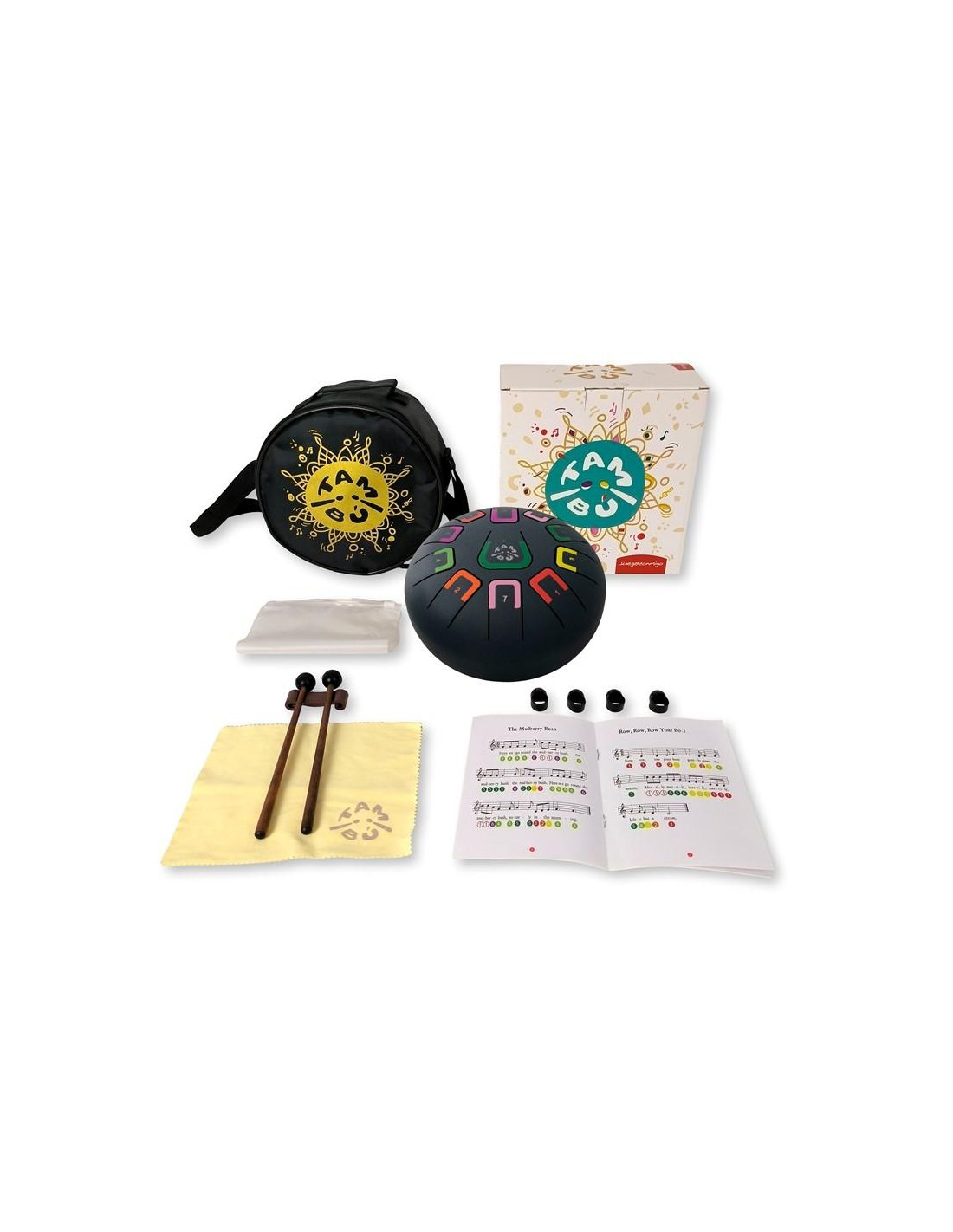 El TAMBÚ puede hacerse sonar de diferentes maneras. Viene acompañados de partituras en números y colores para aquellos que empiezan.